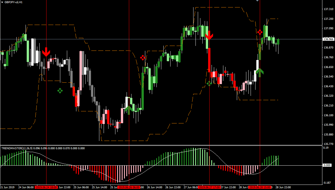 しかし、フィルタリングとしてチャート下のヒストグラムであるTrendmaster(MACD)が同じ方向を示しているときのみエントリーします。