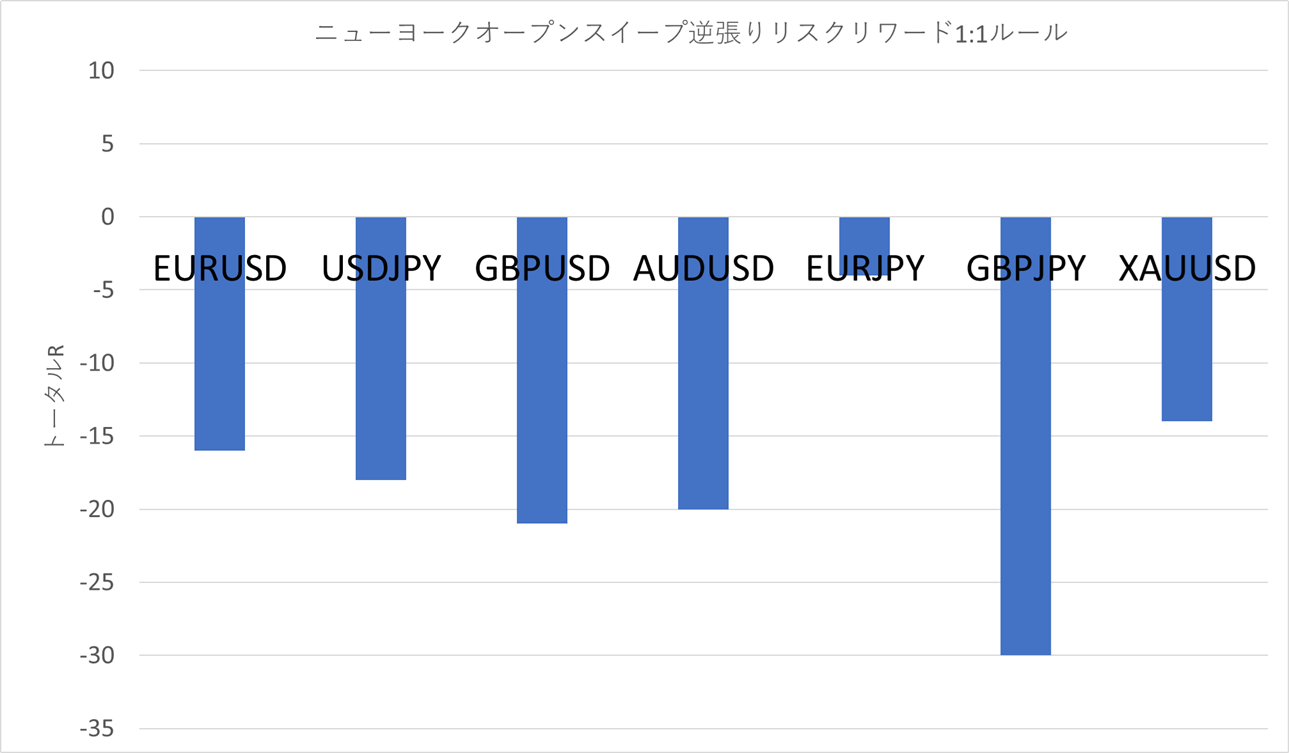 しかしその一方で、ロンドンオープンのレンジををNYオープンレンジキルゾーンでスイープした場合、リスクリワードを1:1にした場合は全ての通貨ペアでマイナスとなってしまいました。