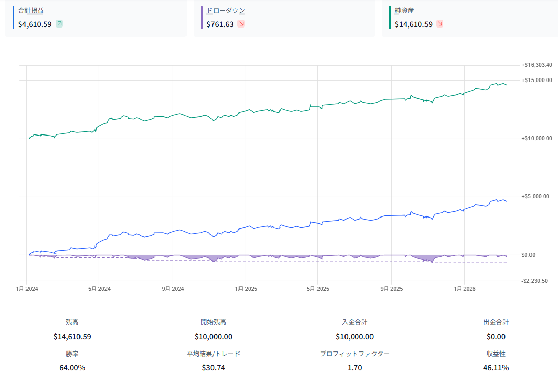 - 損益:+4610.59ドル(10000ドルスタート)