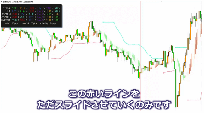 そんな中で、マックスジャッジメント・過去検証ツールは、過去のローソク足に赤いラインをスライドしてやるだけで、その時の通貨の強弱具合がマルチタイムですぐに分かってしまうという優れものです。
