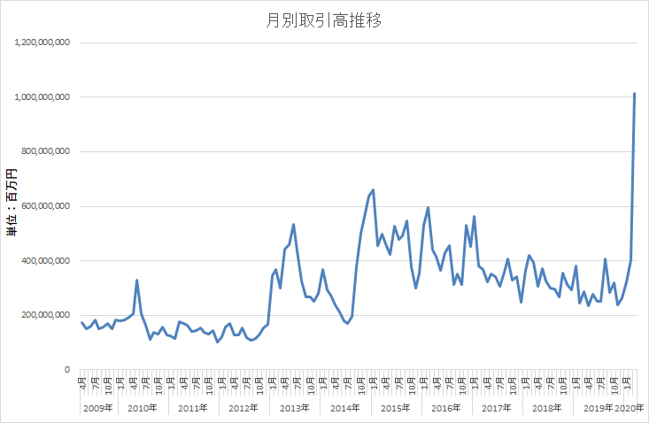 リーマンショック直後の2009年度から2012年度までは2000兆円程度の取引高でしたが、2013年度から一気に4000兆円台にのびました。