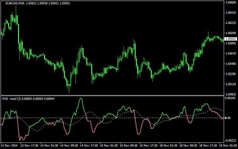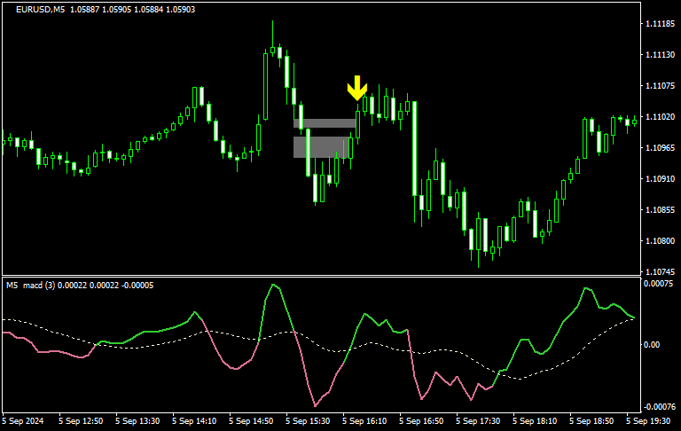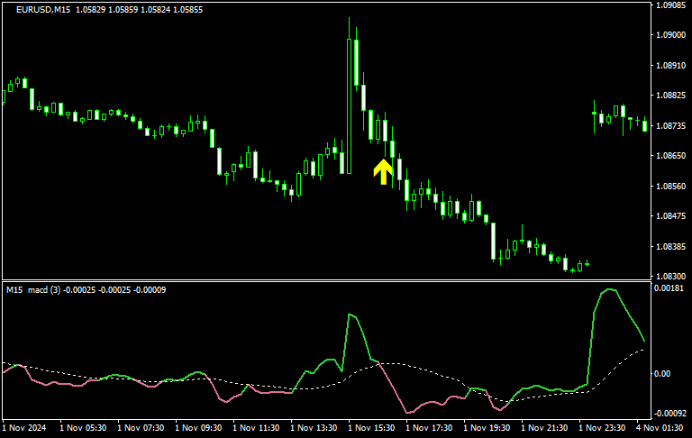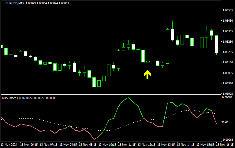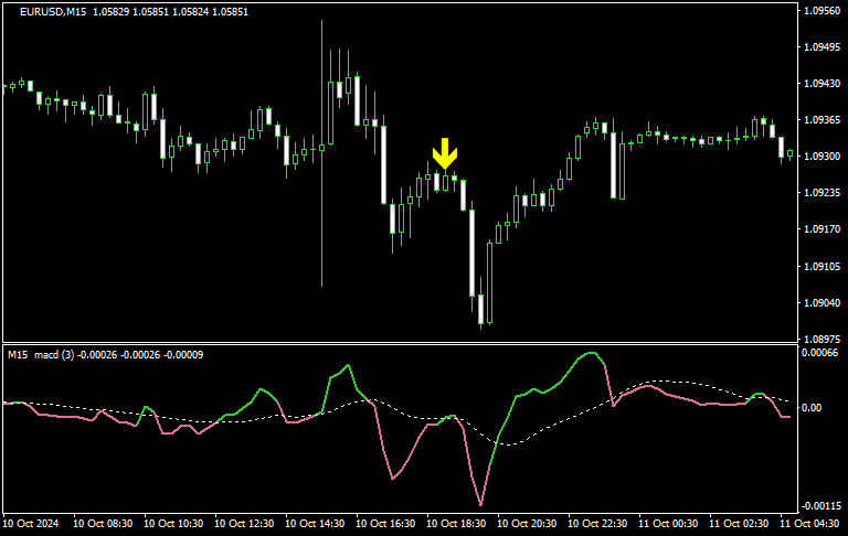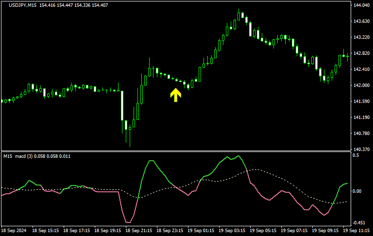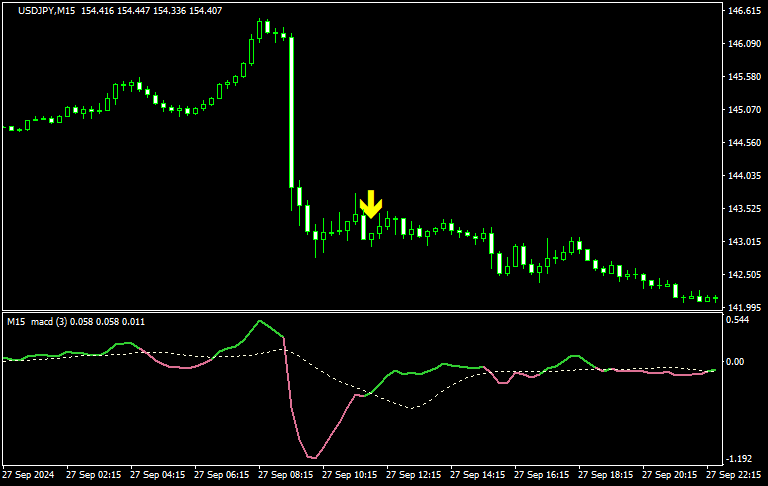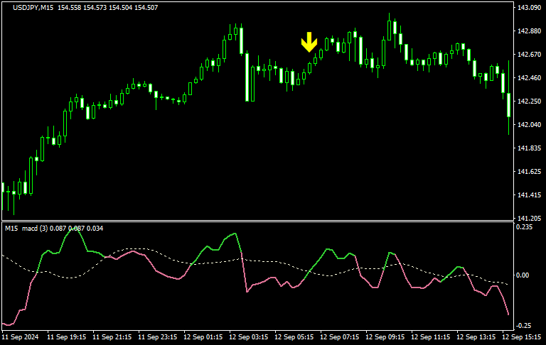 黄色い短期のEMAが白い長期のEMAを上抜けると、MACDラインは0ラインを抜けて上昇します。逆に短期のEMAが長期のEMAを下抜けるとMACDラインは0を割って下落します。