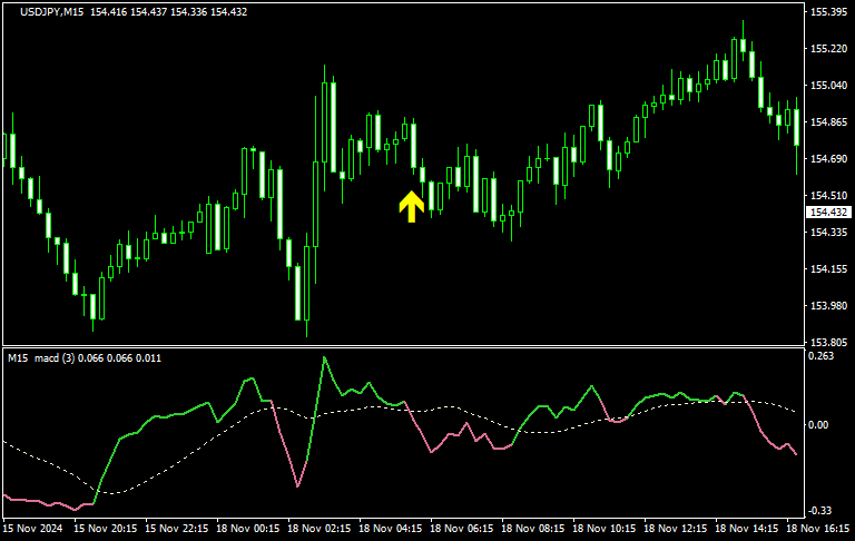 - 上昇後の押し目の時にMACDが下落、シグナルラインが上昇している状態でクロスしていたらロングエントリー