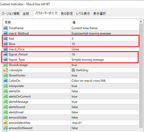 先ほどご紹介したMacd line mtf BTでは以下のように設定を変更してください。