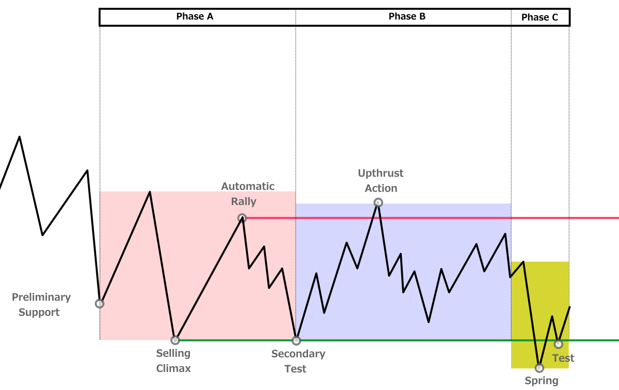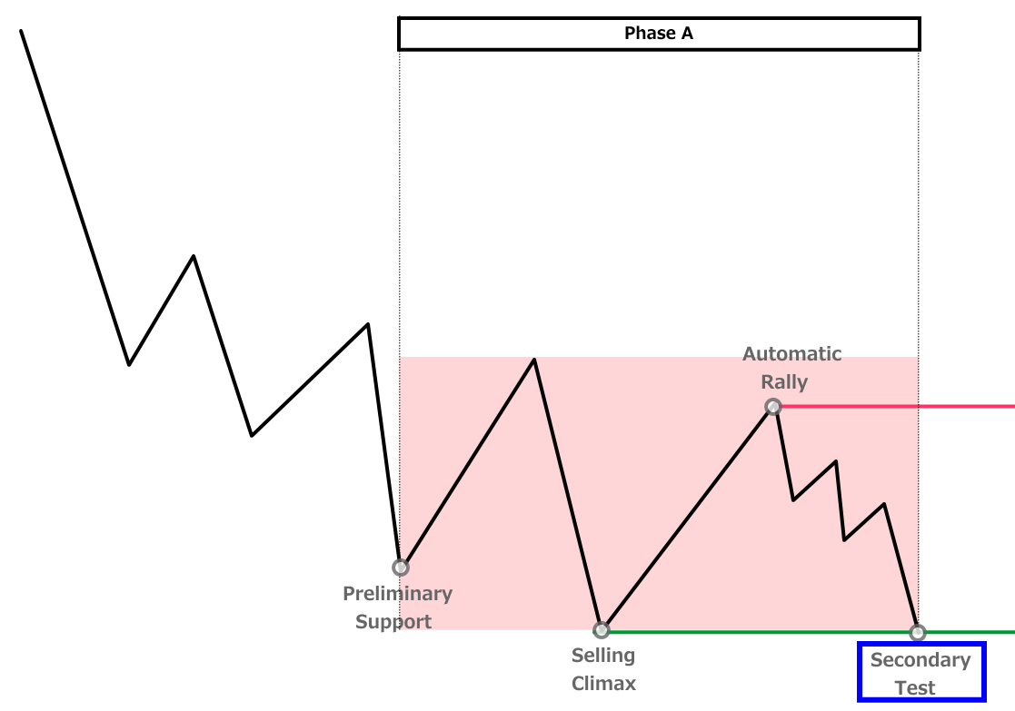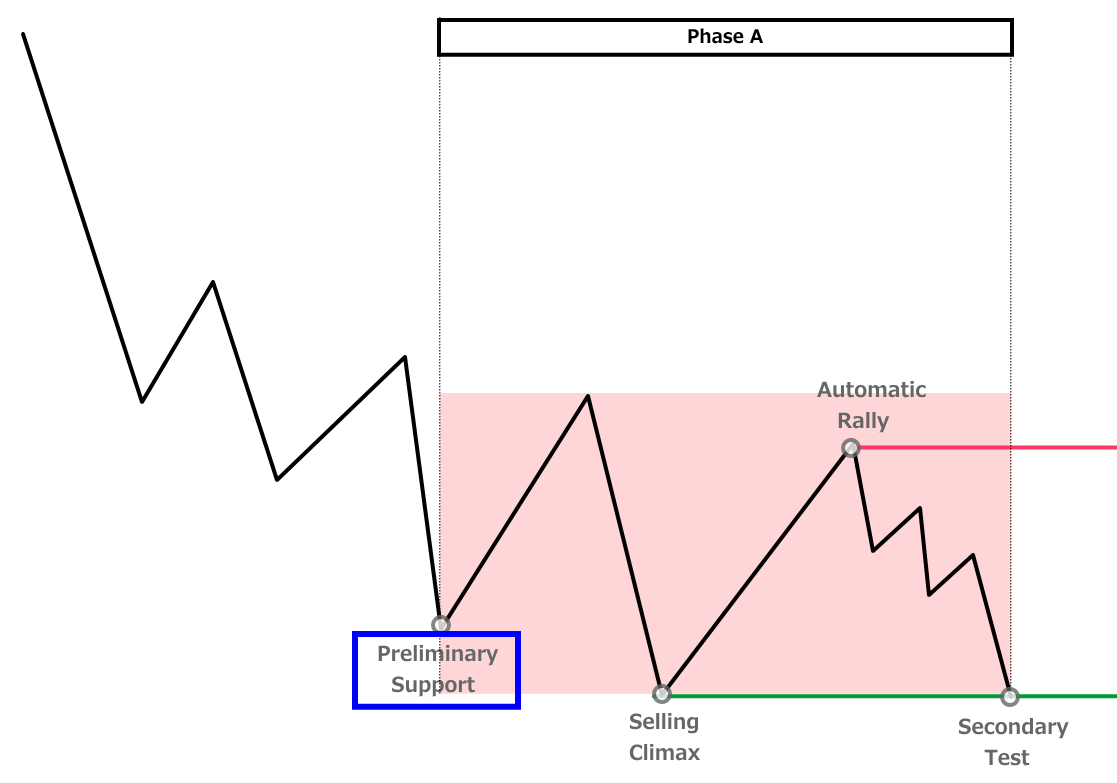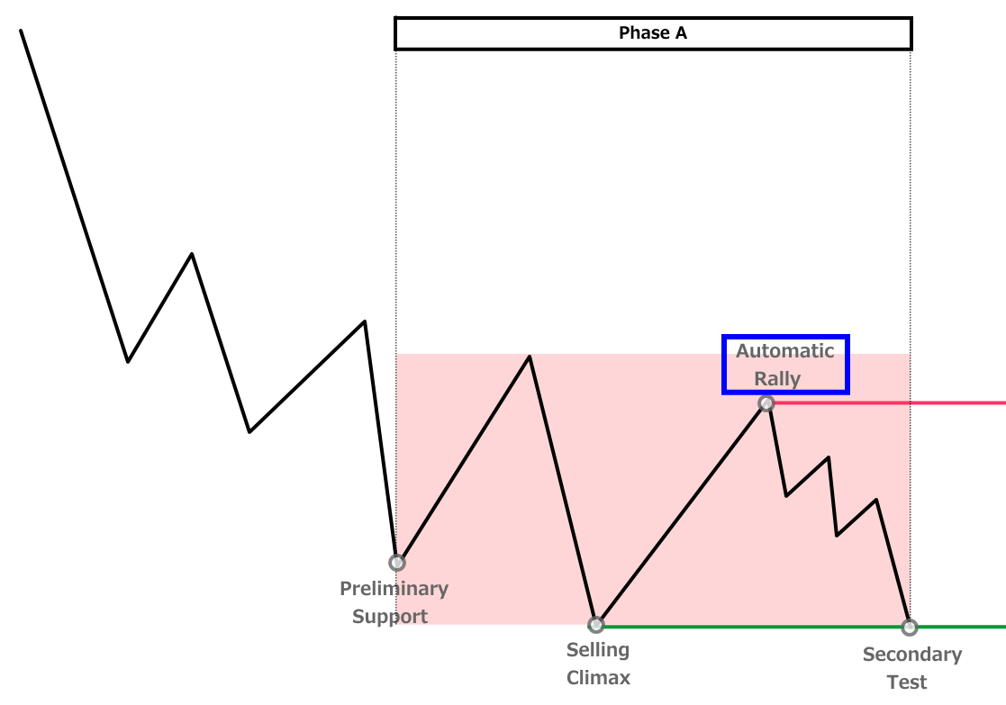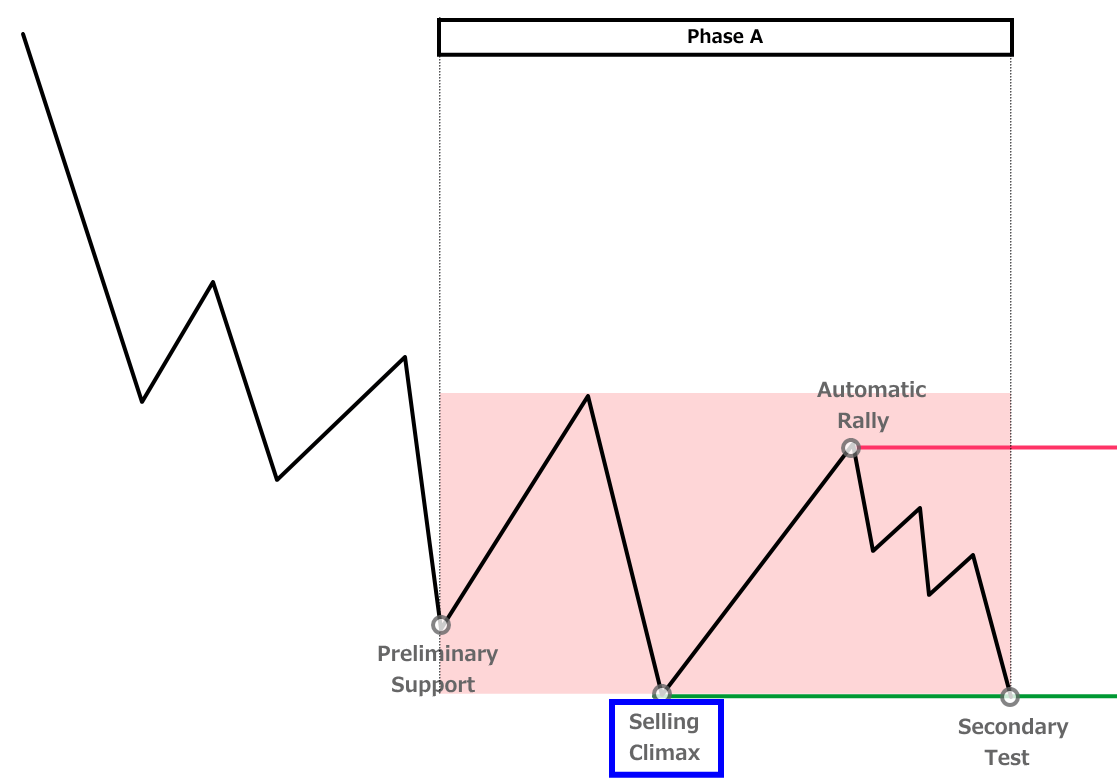 - Phase A:下降トレンドの終わりを示す動き(PS・SC・AR・ST)