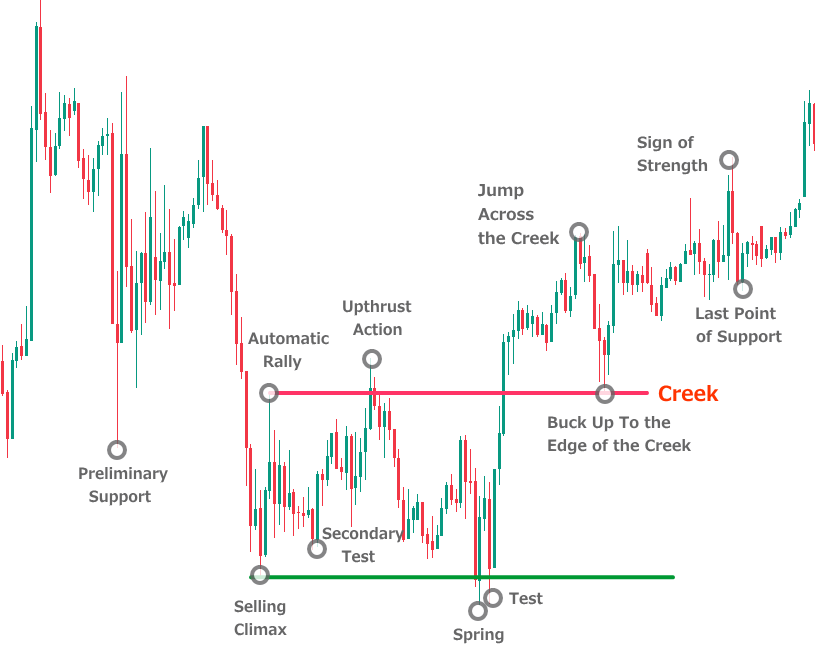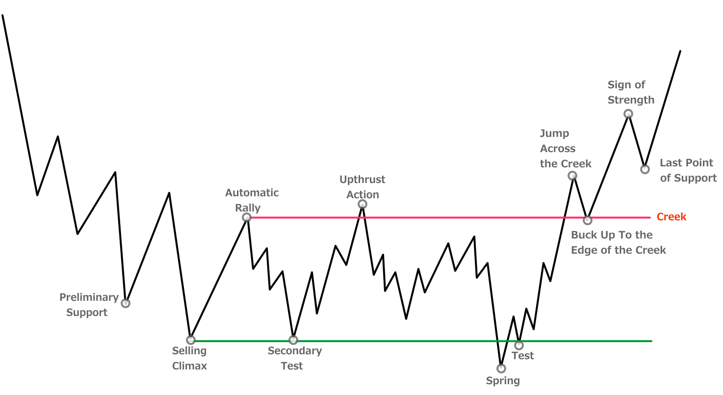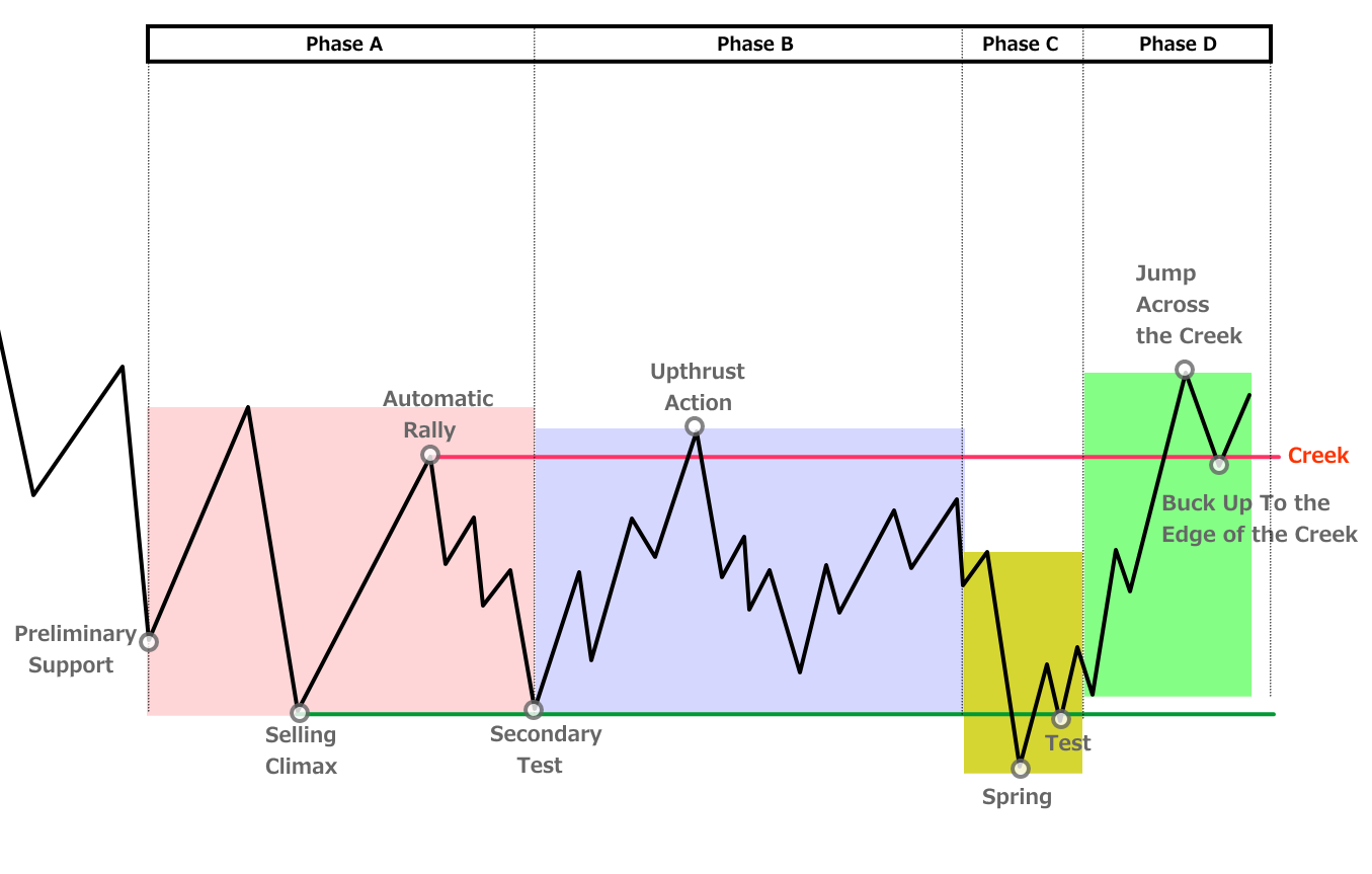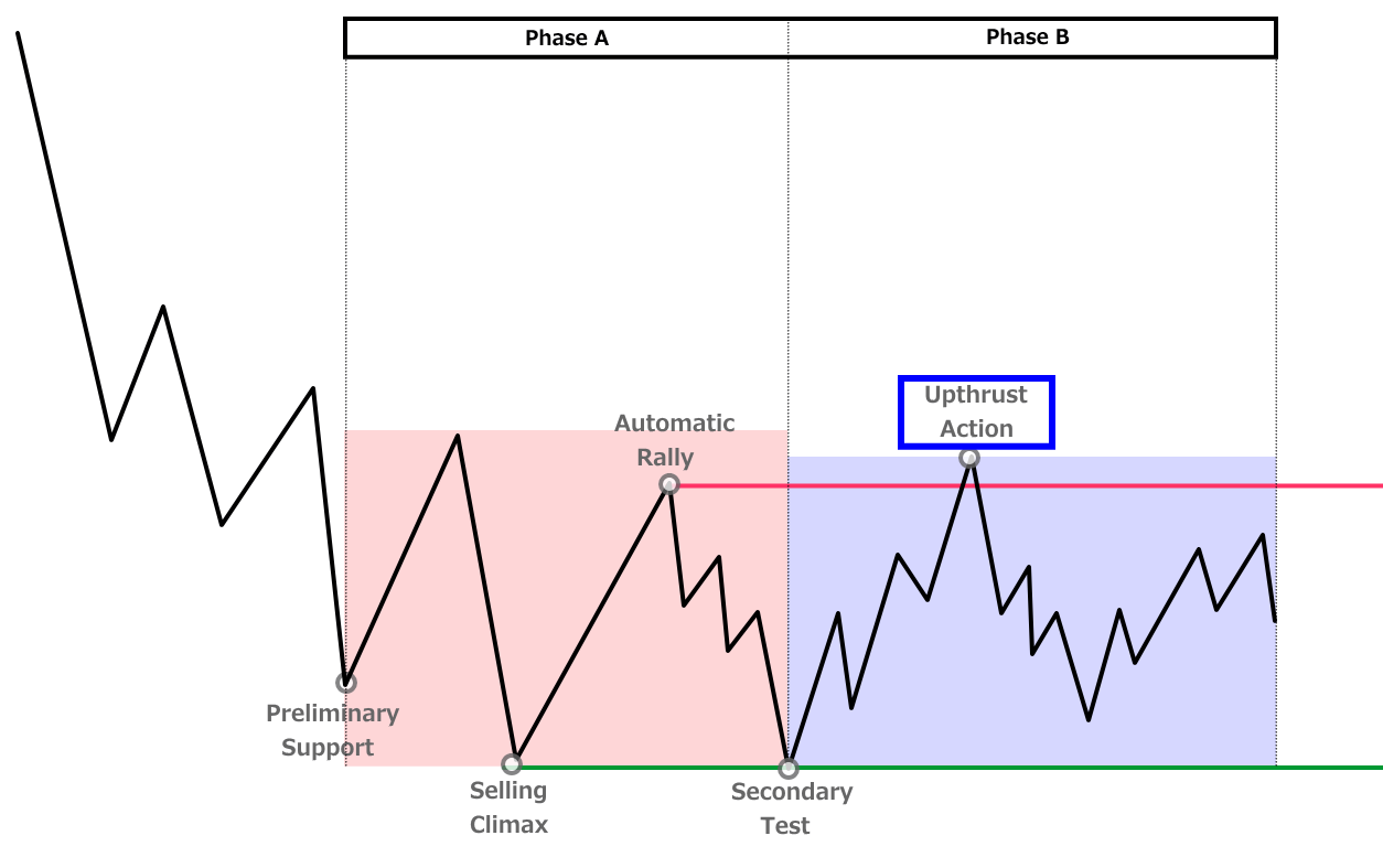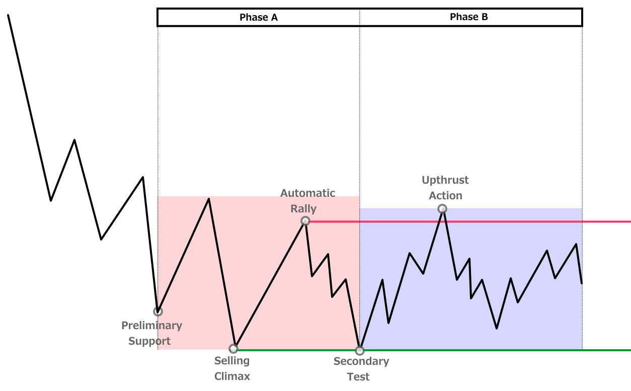 - Phase A:下降トレンドの終わりを示す動き(PS・SC・AR・ST)