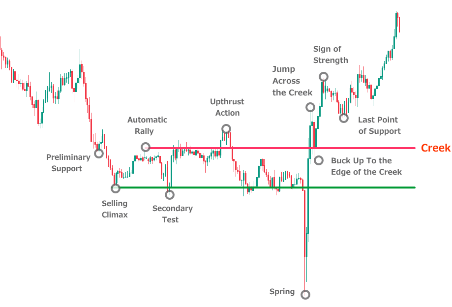 このケースでは反発が強かったためSpring後のTestはありませんでしたが、Creekブレイク後にしっかりとCreekまで押してから高値をブレイクしています。