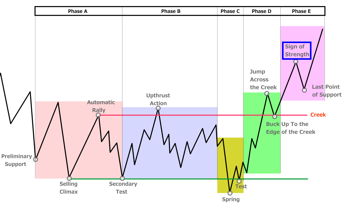 Phase Dの高値をさらにブレイクしていくとSign of Strengthとなり、更に上昇圧力が強いことを意味します。