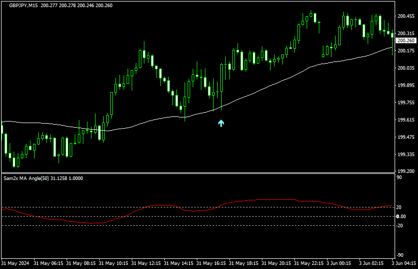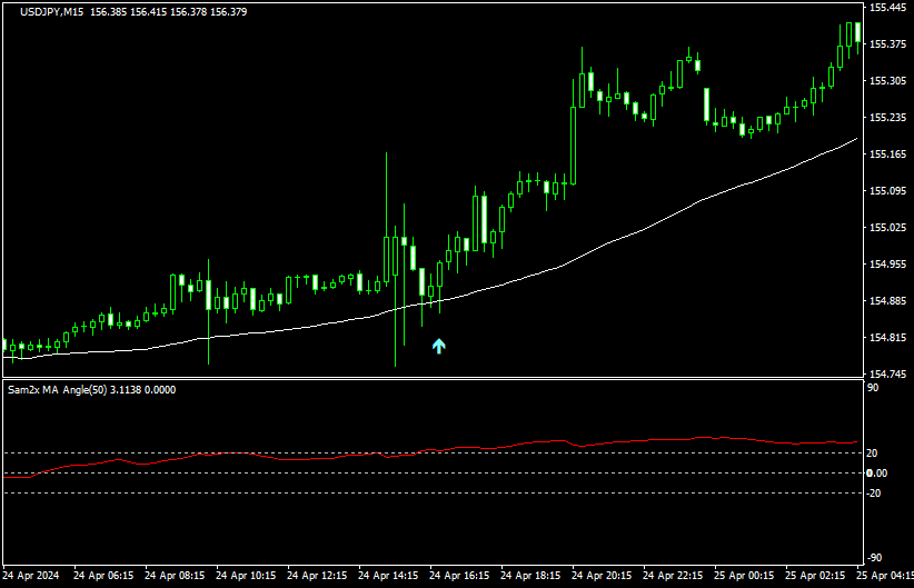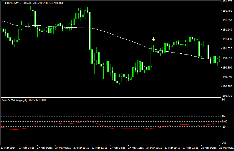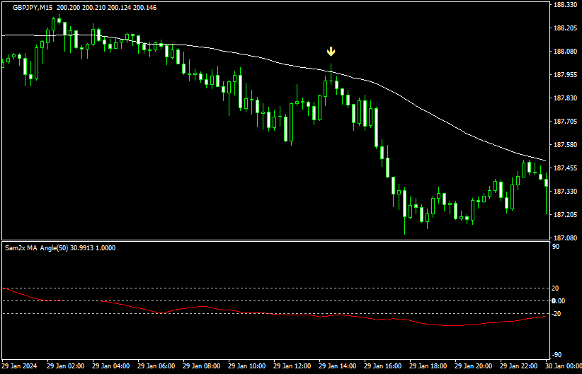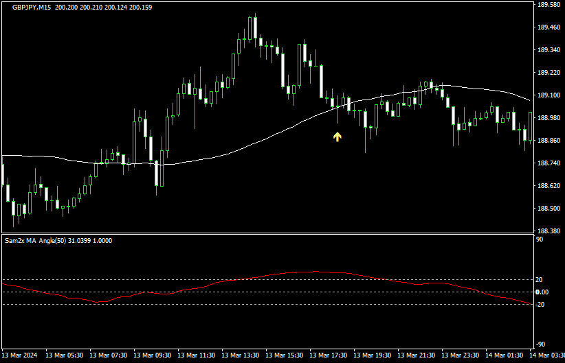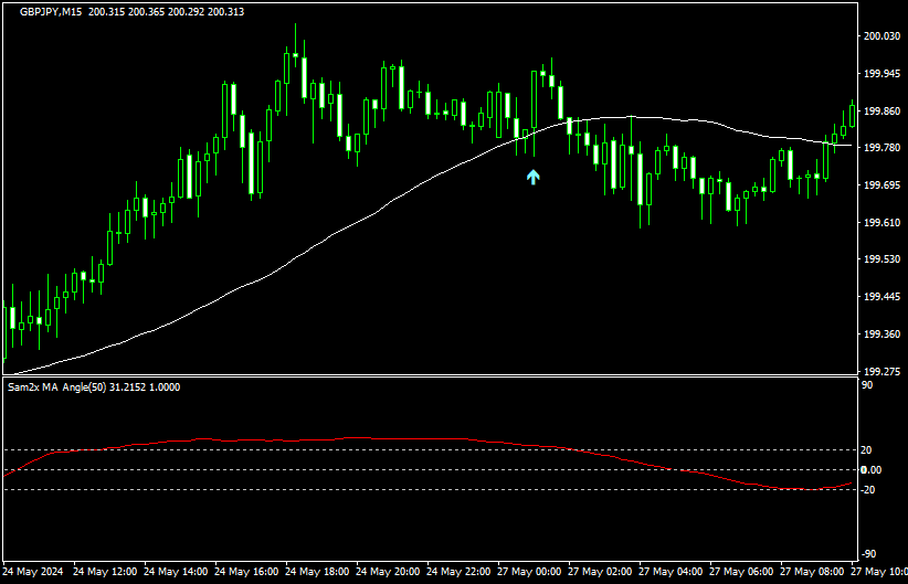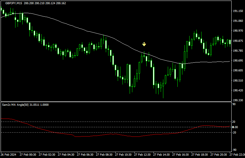 そして、angle of maがこの条件を満たしており、尚且つ後述するローソク足パターンを満たしたらエントリーとします。