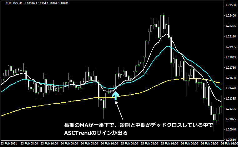 この条件を満たしている時にASCTrendの買いサインが出たらロングシグナルとして表示するようにしました。画像で解説すると以下のようになります。