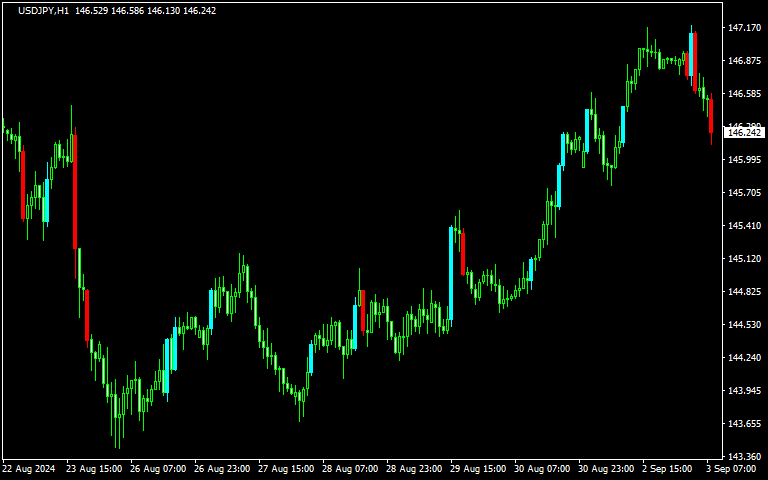今回の検証を行うにあたって、先ほど定義した「実体の大きな足」を検出してローソク足の色を変えるインジケーターを作成しました。