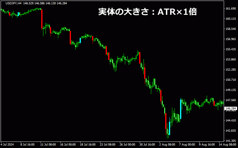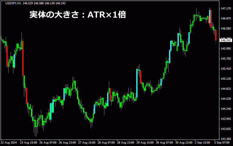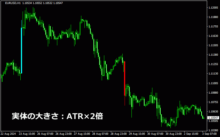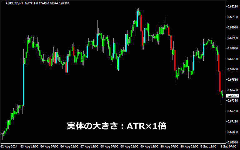 以下はローソク足の実体がその時のATRより大きければ足の色が変わります。(陽線:水色、陰線:赤色)