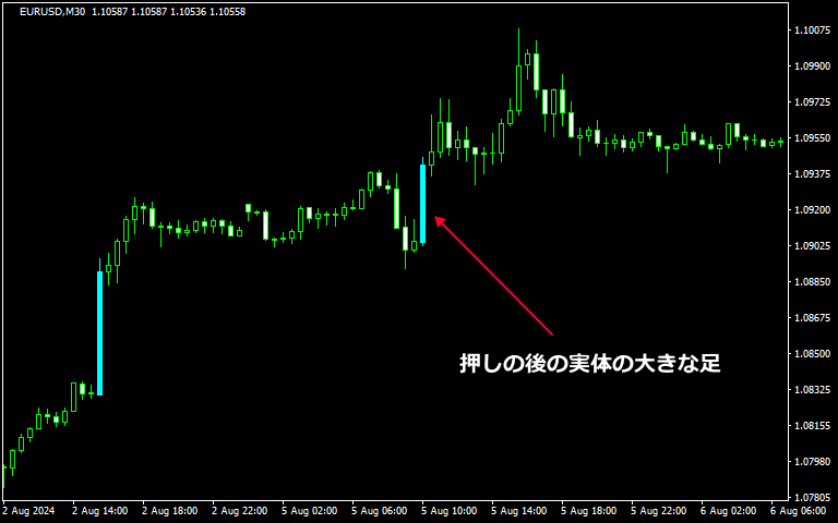 実体の大きな足が出現すると、価格は明らかにその方向へ動きやすい傾向があることが見て取れます。