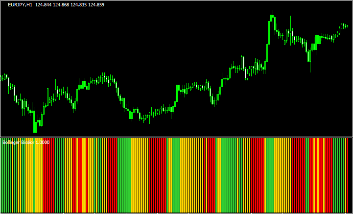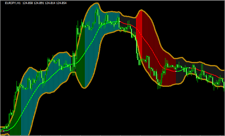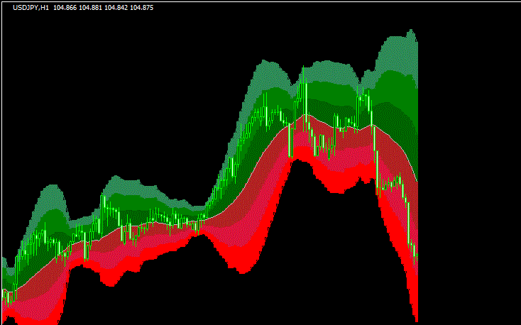 トレンド方向や勢いによってバンド内の色が変わるインジです。