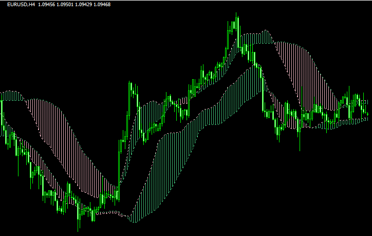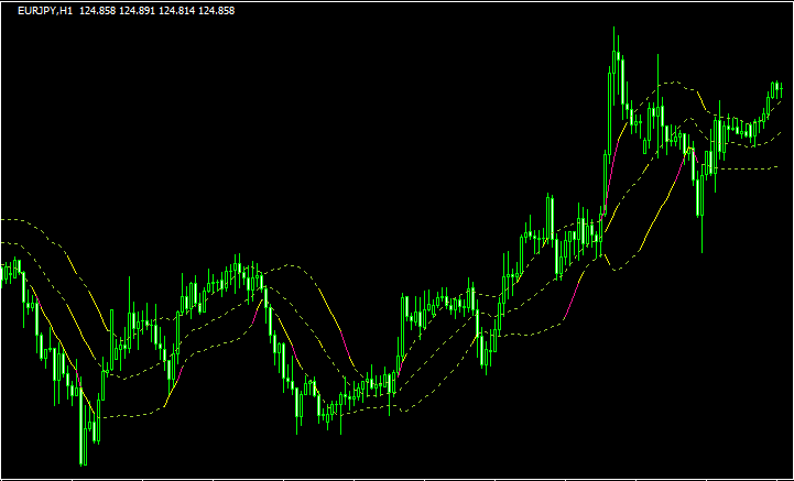 バンドが高い角度で推移するとピンク色、少し勢いが落ちると黄色、勢いがない場合は点線で表示されます。
