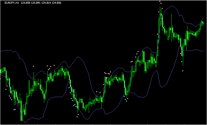 ローソク足の実体がバンドを跨ぐとサインの出るインジです。