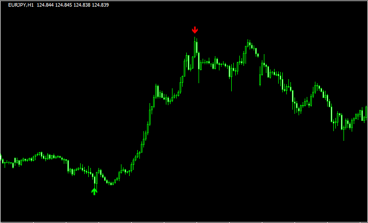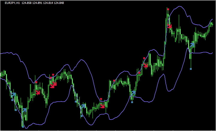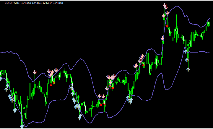 このインジでは、ローソク足がバンドにタッチしたら逆向きのサインが出現し、そこから本格的に逆方向に進んできたら逆張りエントリー用のサインが出るようになています。