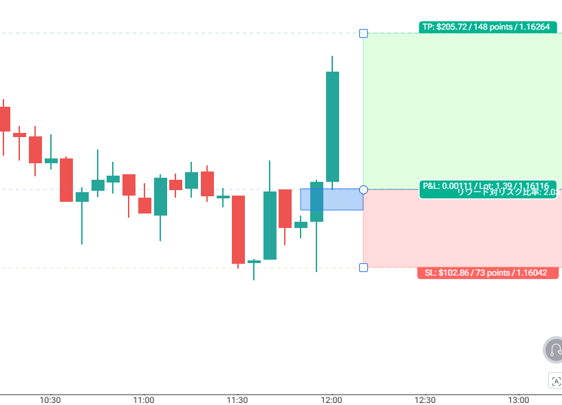 損切りはFVGが生じた足の高値、利食いは損切幅の2倍に設定します。
