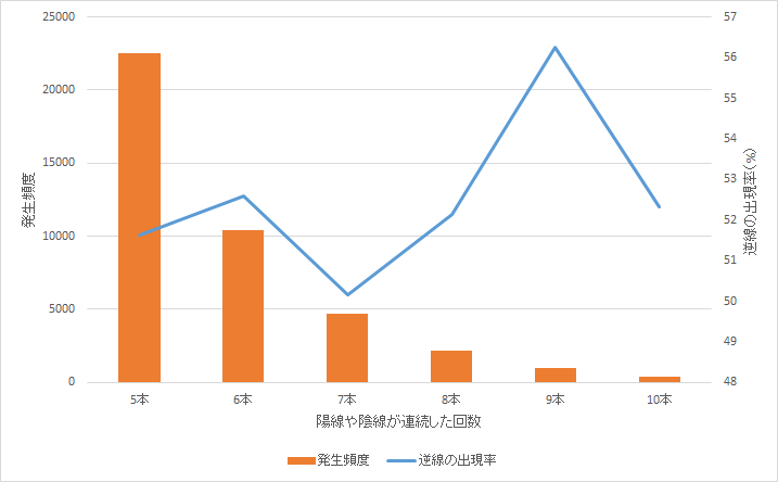 また、併せて陽線や陰線が6本~10本連続して出現した場合、次の足が逆線となる確率はどうなるのかも知りたい。