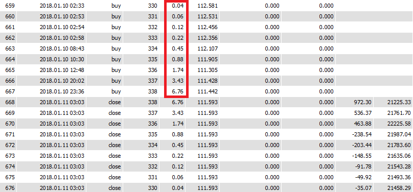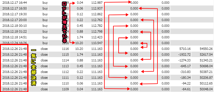 上がバックテストの一部ですが、2018年12月17日から24日にかけて、ドル円のレートが下がる毎にロットを上げてロングポジションを増やしていることが分かります。ナンピンとマーチンゲールを組み合わせています。