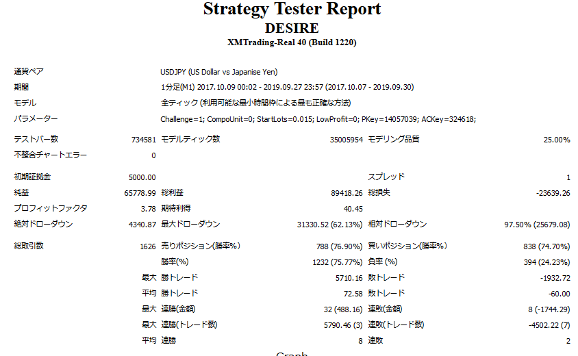 1分足を利用するため、十分過ぎるほどのサンプル数は得られているとは思いますが、ナンピン&マーチン型のため、この2年間だけ何とか生き残れた可能性も払拭できません。