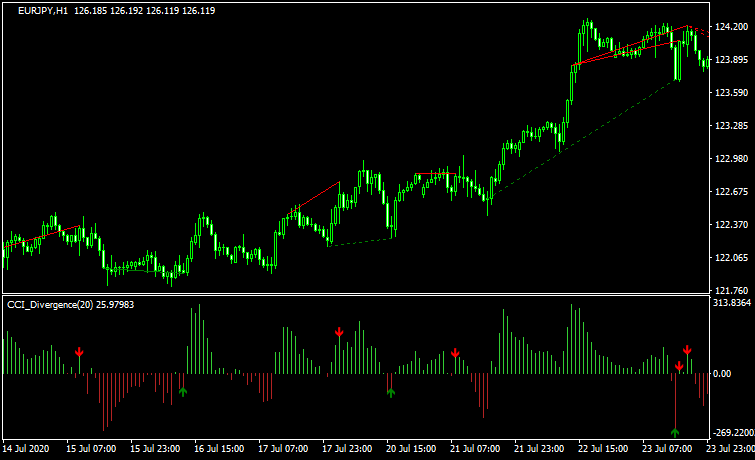 CCIをヒストグラム表示し、ダイバージェンスをラインとサインで知らせてくれます。