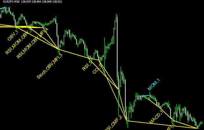 オシレーターは表示されず、ローソク足上にダイバージェンスしたポイントがラインがラインで結ばれますので、反転しそうな個所が一目でわかります。