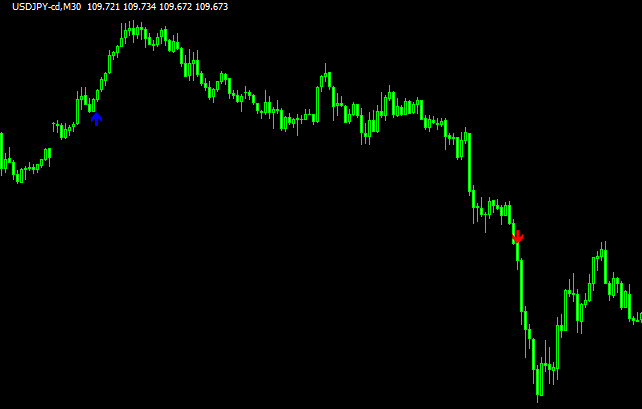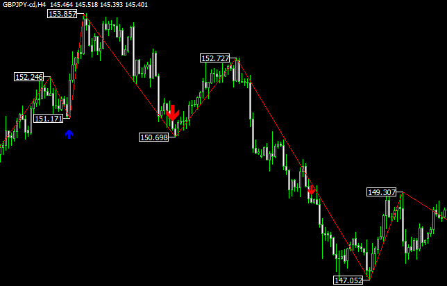 これはジグザグをベースとしながらも、ダウ理論によるトレンド方向をシグナルとして表示してくれる非常に優れたインジです。ジグザグなのでライン自体はリペイントしてしまいますが、シグナル自体はリペイントしません。