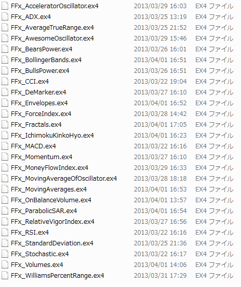 FFx standard indicatorsで表示できるインジは以下の27種類です。