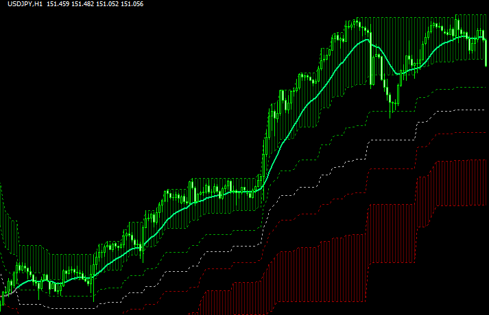 押し目や戻りの局面では、ローソク足の上下に緑色のゾーンが表示されて見やすいです。