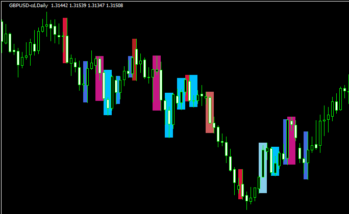 ローソク足のプライスアクションを認識して、特定のパターンになるとローソク足上にレクタングルが表示されるインジケーターです。MT4だと以下のような表示になります。