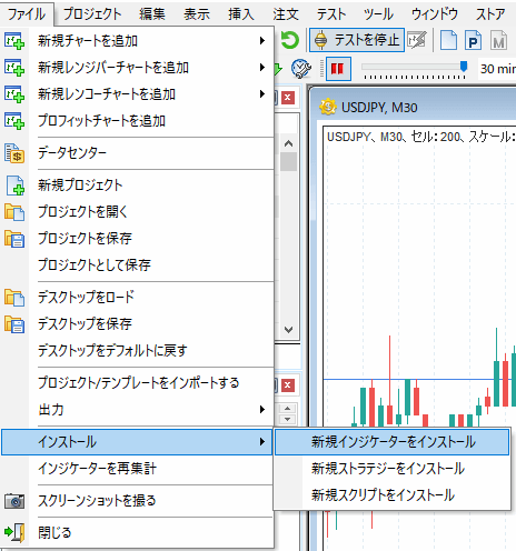 まずはFT4の左上の「ファイル」から「インストール」を選択して「新規インジケーターをインストール」を選択します。