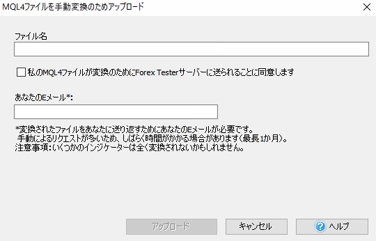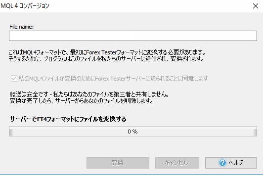 mq4ファイルを選択して「変換」を押すと、データがForex Testerのサーバーに送られてコンバートされます。