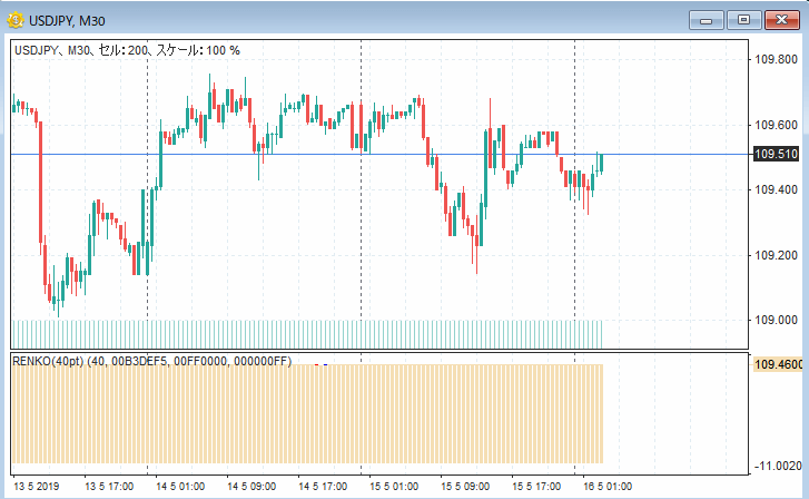 このインジについては、コンバートは完了し、インストールもされましたが、チャートにバーが表示されるだけで練行足は出てきませんでした。