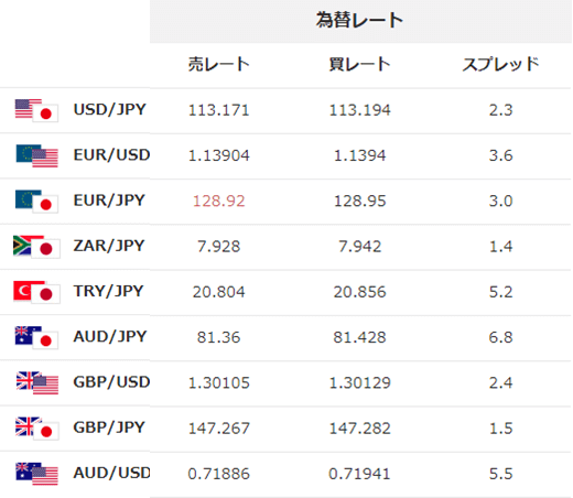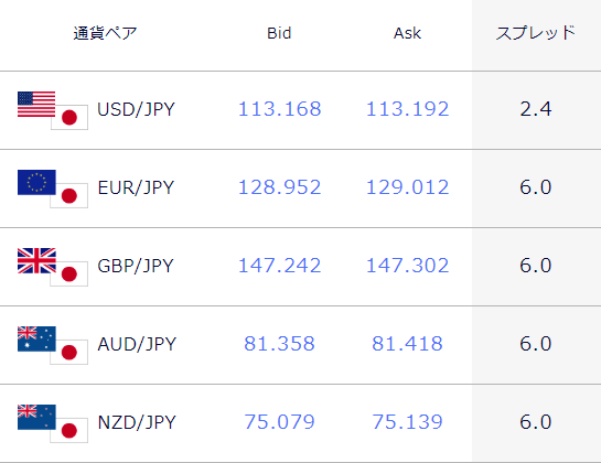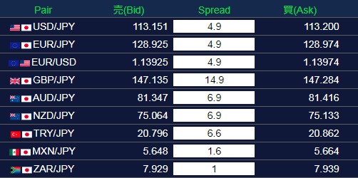 以下は2018年11月5日月曜日の朝7時~7時10分頃までの各FX業者の配信レートをキャプチャーしたものです。