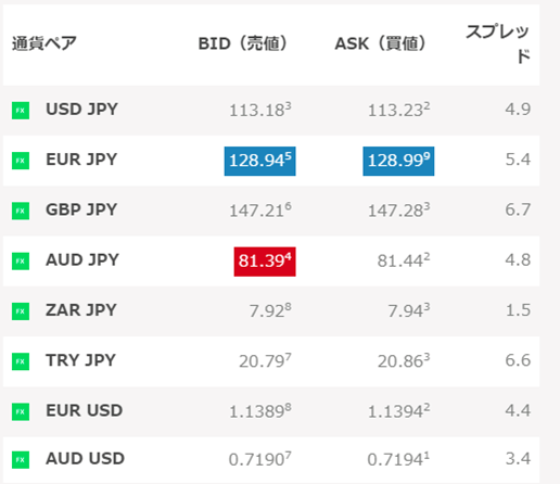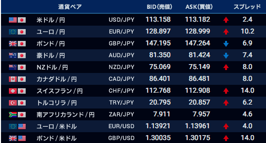 各FX業者の月曜日7時~7時10分までの配信レート