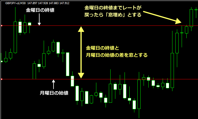 - 窓埋め:月曜日のニューヨーク時間が終わるまでに金曜日の終値まで戻ったら窓埋めとする。