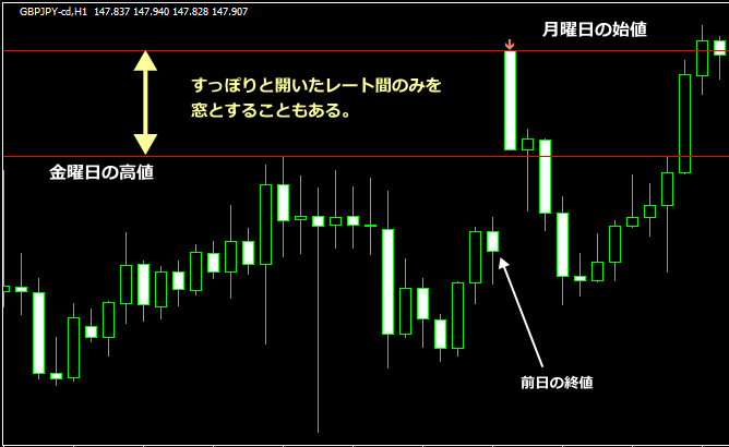 FX市場では週に1回、金曜日の終値と月曜日の始値の間に窓が開くことがあります。