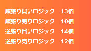 ジーニアス・ブレインFXでは49個のロジックを上手に組み合わせて、長期的に資産を増やしていく事を目的にしています。49個のロジックの内容は以下の通りです。