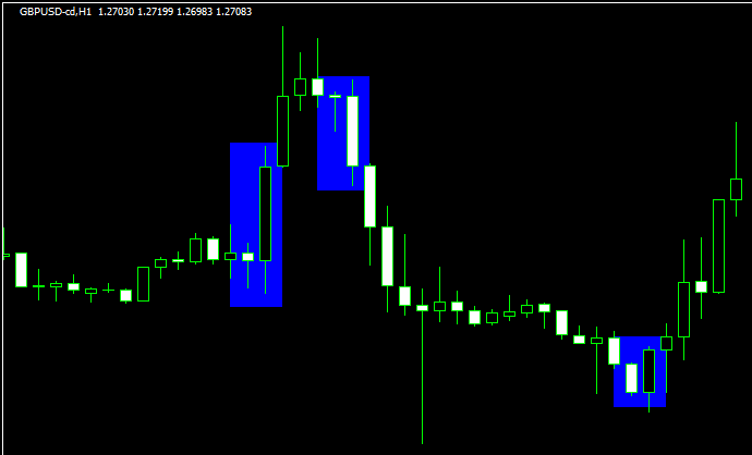 特に上のチャートの青い四角で囲った箇所のように、一つ前の足が小さく、その次の足が大陽線、もしくは大陰線の包み足場合はトレンド転換になることも多く、私もエントリーやエグジットの参考にしています。