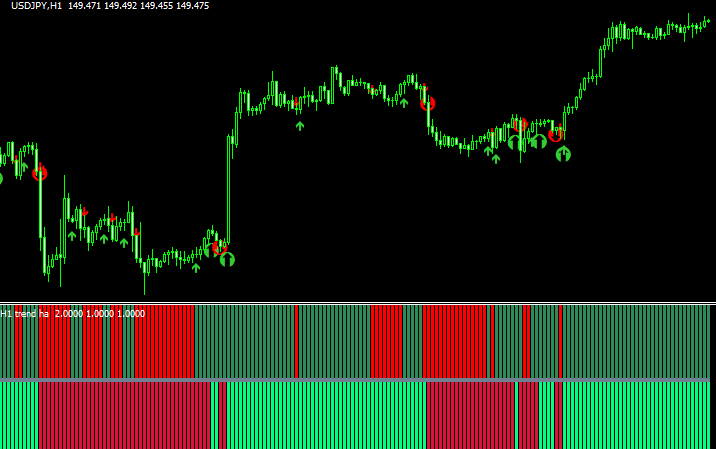 他にもマルチタイムにも対応しており、上位足の平均足MAのトレンド方向を示すことも可能です。