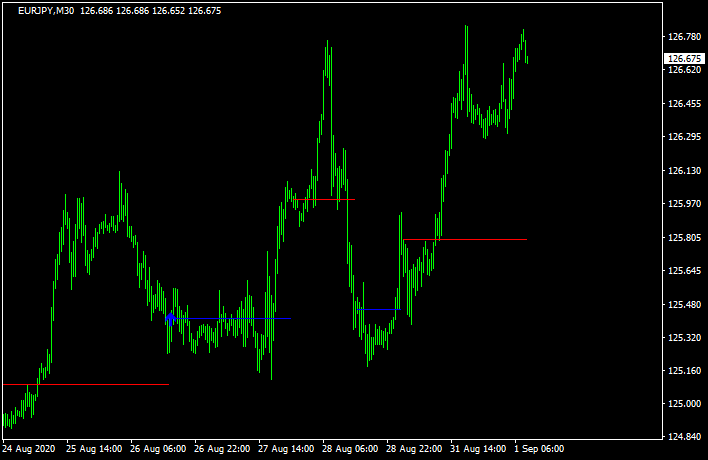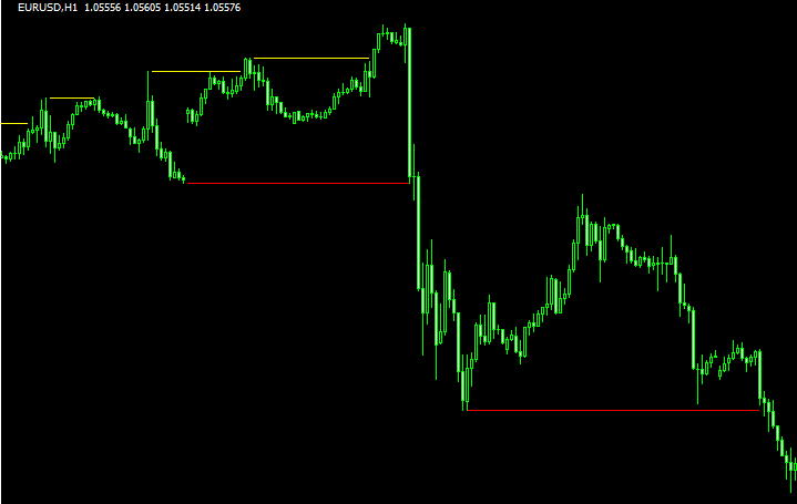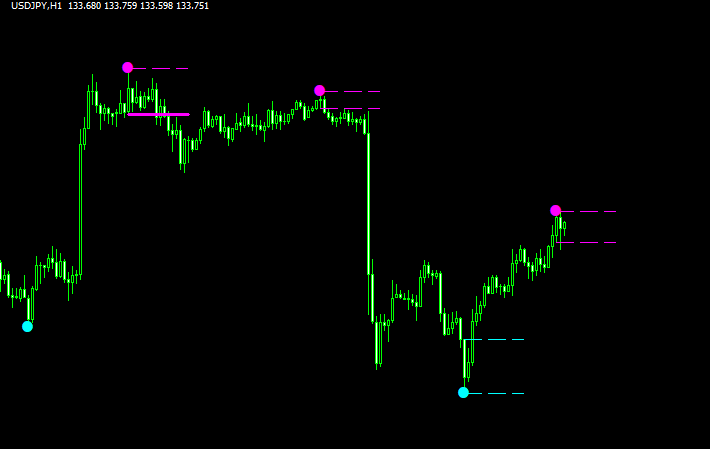 主にMT4にデフォルトで入っている「フラクタル」を利用して、相場の高値や安値を認識してラインを引くインジです。