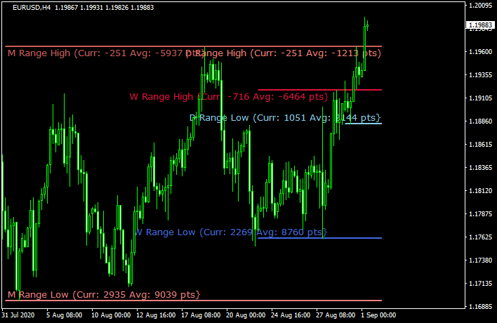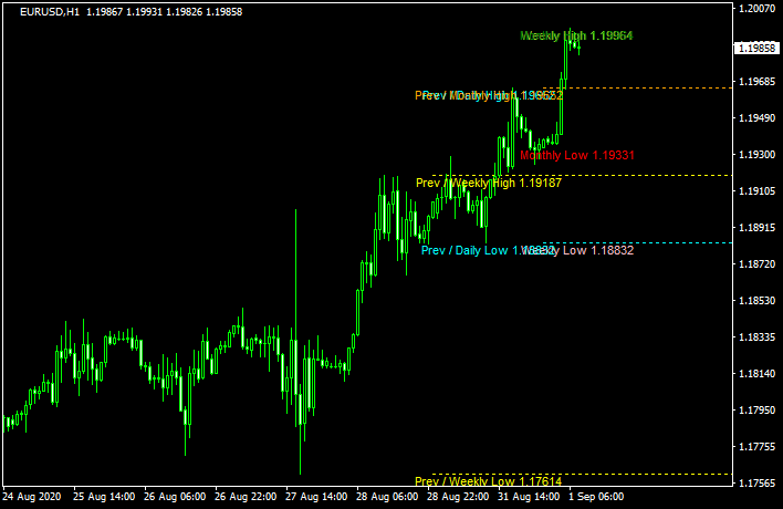 過去1ヶ月、過去1週間、その日の高値や安値のレートにラインを引くインジです。
