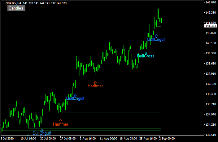 特定のローソク足パターンを認識し、その高値や安値から水平線が引かれるインジです。