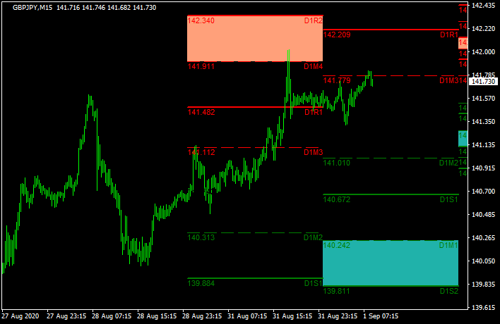 このインジもどのレートにラインを引くかの選択が可能で、指定した期間をレクタングルで囲ったり、ピボットを表示することもできます。