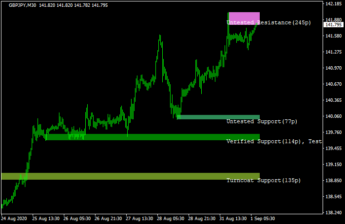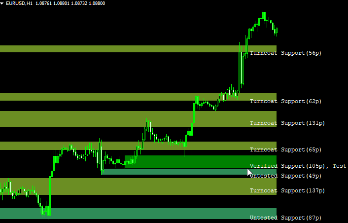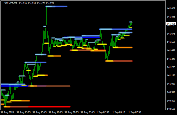 このインジではゾーンの特徴や重要度について6種類に色分けされます。