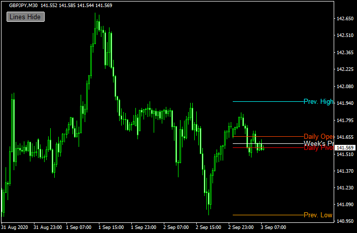 当日の始値、前日の高値安値、前週の高値や安値などをラインで示すインジです。