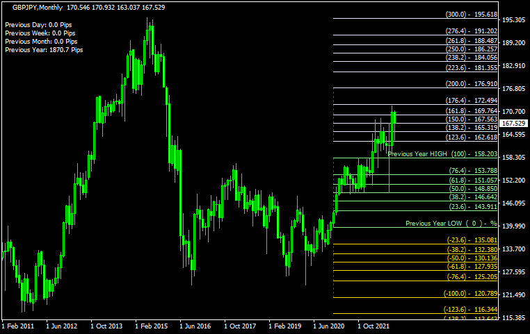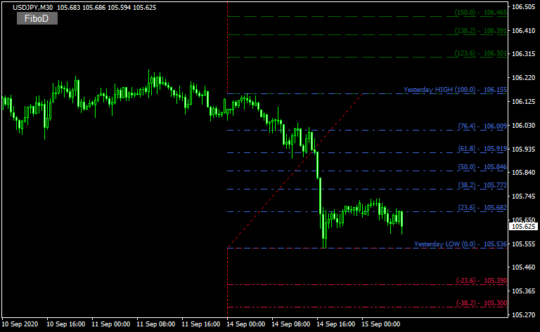 前日の高値安値に対してフィボナッチリトレイスメント&エクスパンションを表示します。