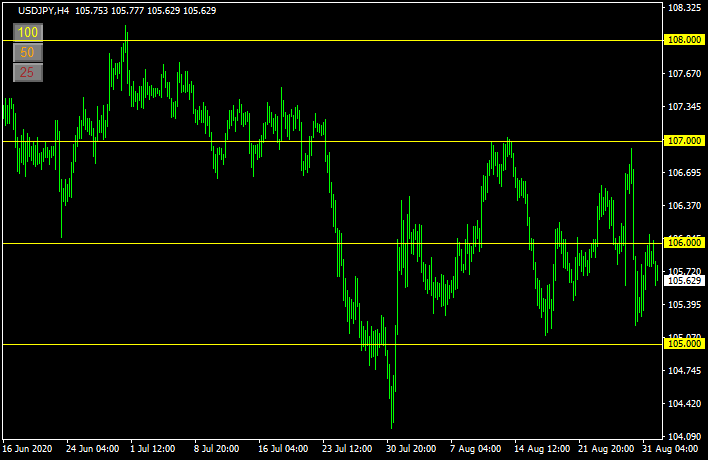 100を押せば100pipsごと、50を押せば50pips、25を押せば25pipsごとの水平線になります。