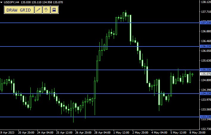 チャート左上のボタンを押すとラウンドナンバーのレートに水平線が表示されます。